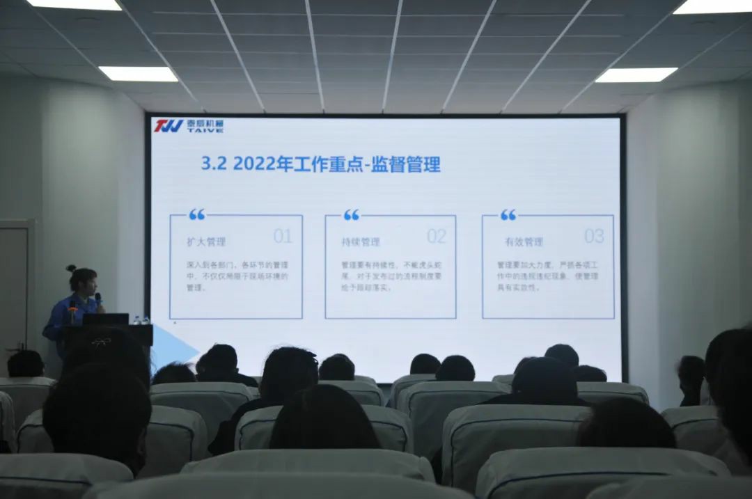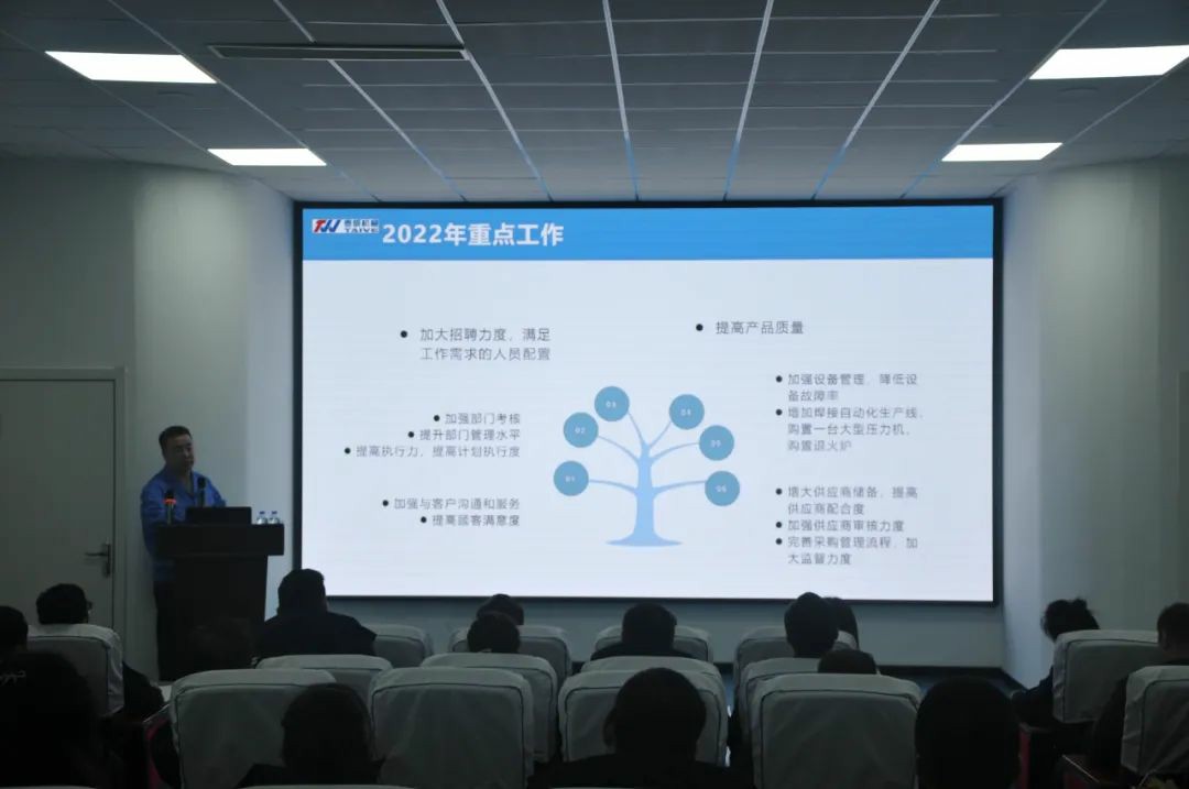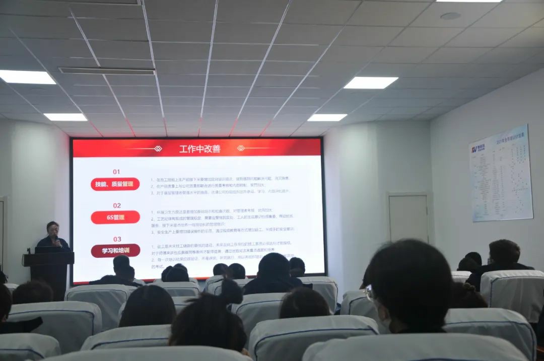 生產(chǎn)部部長從“去年工作回顧”“取得工作成果”“工作不足改善”“新年工作計(jì)劃”四個(gè)方面出發(fā),對(duì)2021的全年工作情況進(jìn)行了總結(jié)概述,匯報(bào)了本年度生產(chǎn)任務(wù)的完成情況,重點(diǎn)強(qiáng)調(diào)了安全生產(chǎn)管理,提出要時(shí)刻做到“警鐘長鳴”,認(rèn)真執(zhí)行安全操作管理規(guī)定,落實(shí)安全培訓(xùn),讓安全意識(shí)深入人心;展示了2021年各方面工作取得的成果,同時(shí)指出了工作中存在的不足及改善措施,并提出了相關(guān)建議,制定了2022年的工作目標(biāo)。
